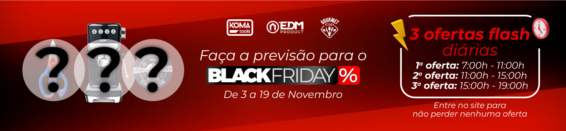 Há mais de 28 anos EDM é uma das principais marcas dentro do setor das lojas de ferragens e bricolagem, em Espanha e Portugal. Em 2019, foram criadas as marcas Koma Tools (ferramenta manual e elétrica) e Gourmet Kitchen (utensílios de cozinha). Com uma relação qualidade-preço imbatível. Procuramos oferecer aos nossos clientes um produto competitivo e atrativo para os seus negócios.